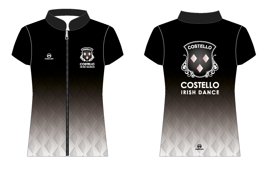 Fully Customised Irish Dance Zip Jig Top. Perfect For Feis. Short Sleeve, Collared Top with Full Zip opening.  Modern Design combined with ultimate comfort.