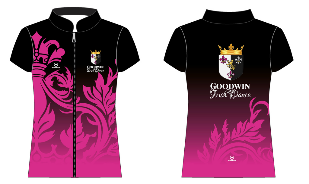 Fully Customised Irish Dance Zip Jig Top. Perfect For Feis. Short Sleeve, Collared Top with Full Zip opening.  Modern Design combined with ultimate comfort.