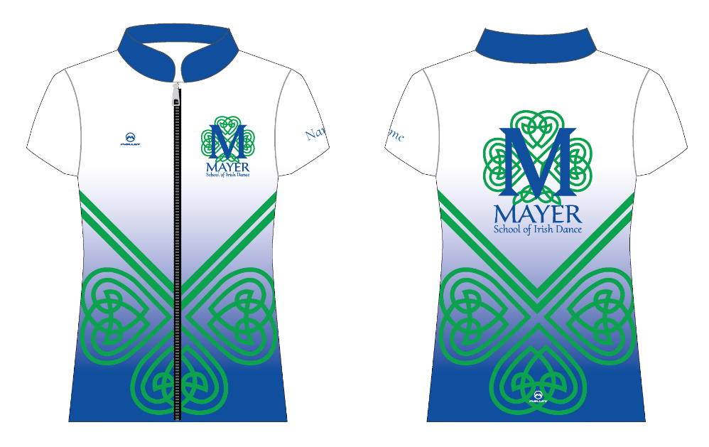Fully Customised Irish Dance Zip Jig Top. Perfect For Feis. Short Sleeve, Collared Top with Full Zip opening.  Modern Design combined with ultimate comfort.