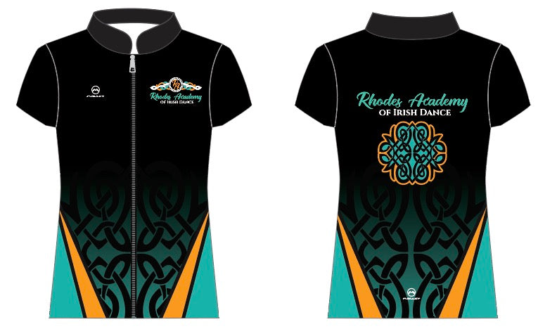 Fully Customised Irish Dance Zip Jig Top. Perfect For Feis. Short Sleeve, Collared Top with Full Zip opening.  Modern Design combined with ultimate comfort.