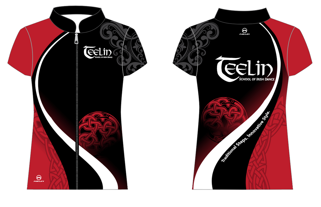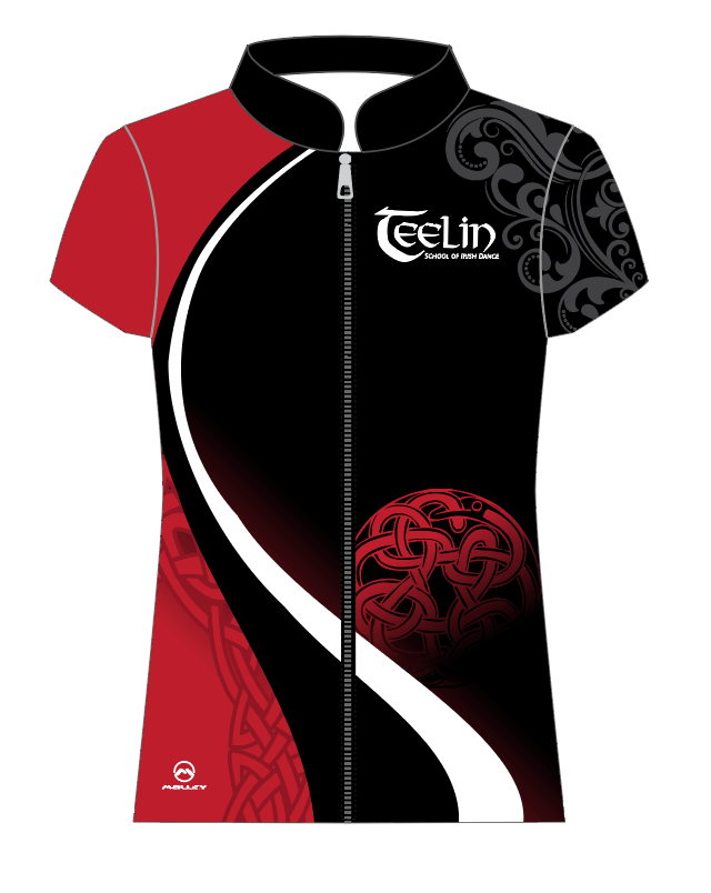 Fully Customised Irish Dance Zip Jig Top. Perfect For Feis. Short Sleeve, Collared Top with Full Zip opening.  Modern Design combined with ultimate comfort.